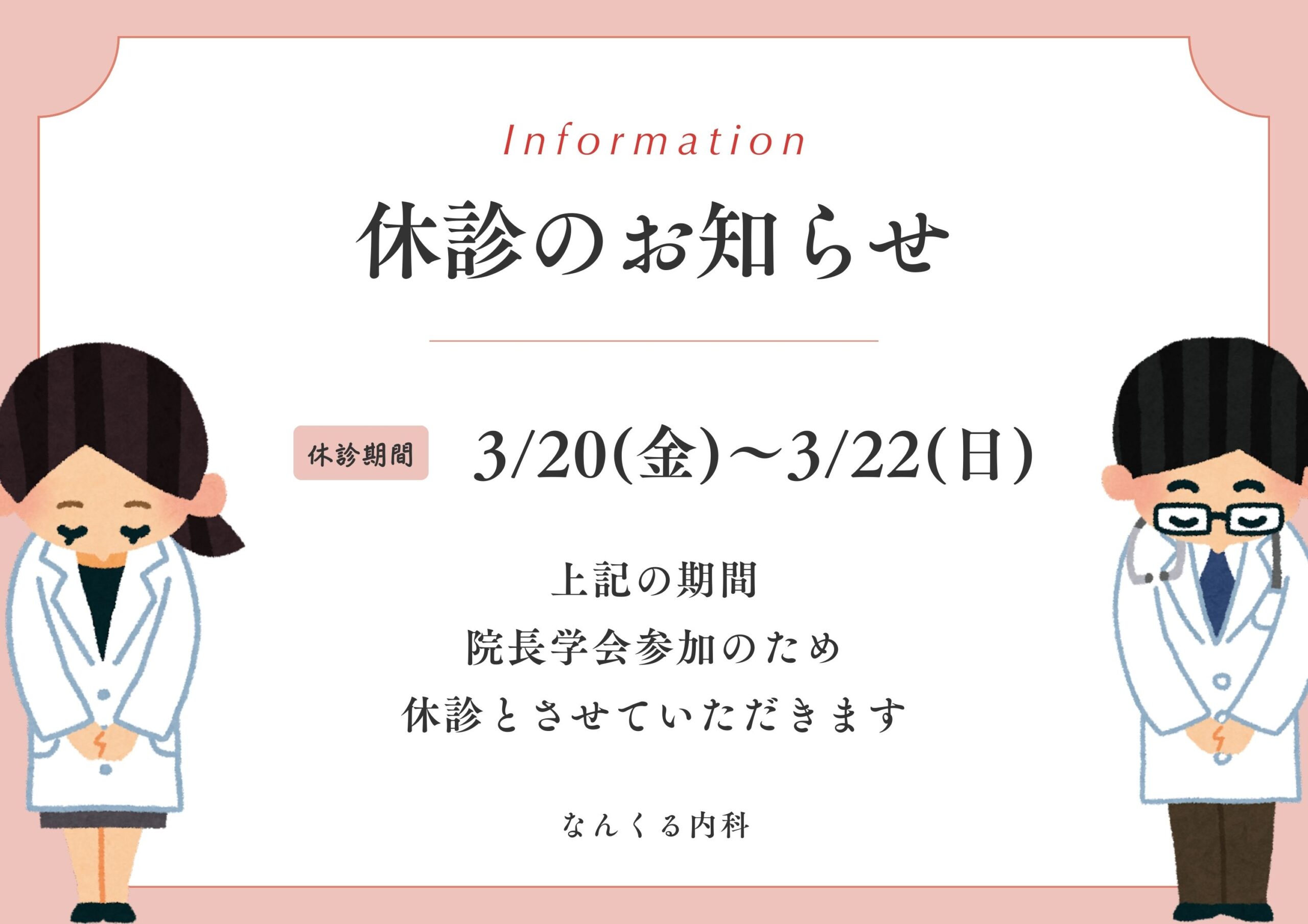 休診のお知らせ 2026 3/19 お知らせ 2026年3月19日 院長が学会参加のため3月20日(金)~22日(日)まで休診といたします。 ご迷惑をお掛けいたしますがご理解のほどよろしくお願いいたします。 お知らせ よかったらシェアしてね! URLをコピーしました! URLをコピーしました! 年末年始 休診のお知らせ この記事を書いた人 Nanklenaika 関連記事 年末年始 休診のお知らせ 2025年12月25日 旧盆休みに関して 2025年9月1日 休診のおしらせ 2025年6月21日 臨時休診のお知らせ 2025年3月28日 年末年始の休診に関して 2024年12月2日 高齢者インフルエンザワクチン、新型コロナワクチン接種の受付開始 2024年10月4日 ホームページリニューアルしました 2024年6月3日 旧盆にともなう休診のお知らせ 2023年8月30日 コメント コメントする コメントをキャンセルコメント ※ 名前 ※ メール ※ サイト 次回のコメントで使用するためブラウザーに自分の名前、メールアドレス、サイトを保存する。 Δ